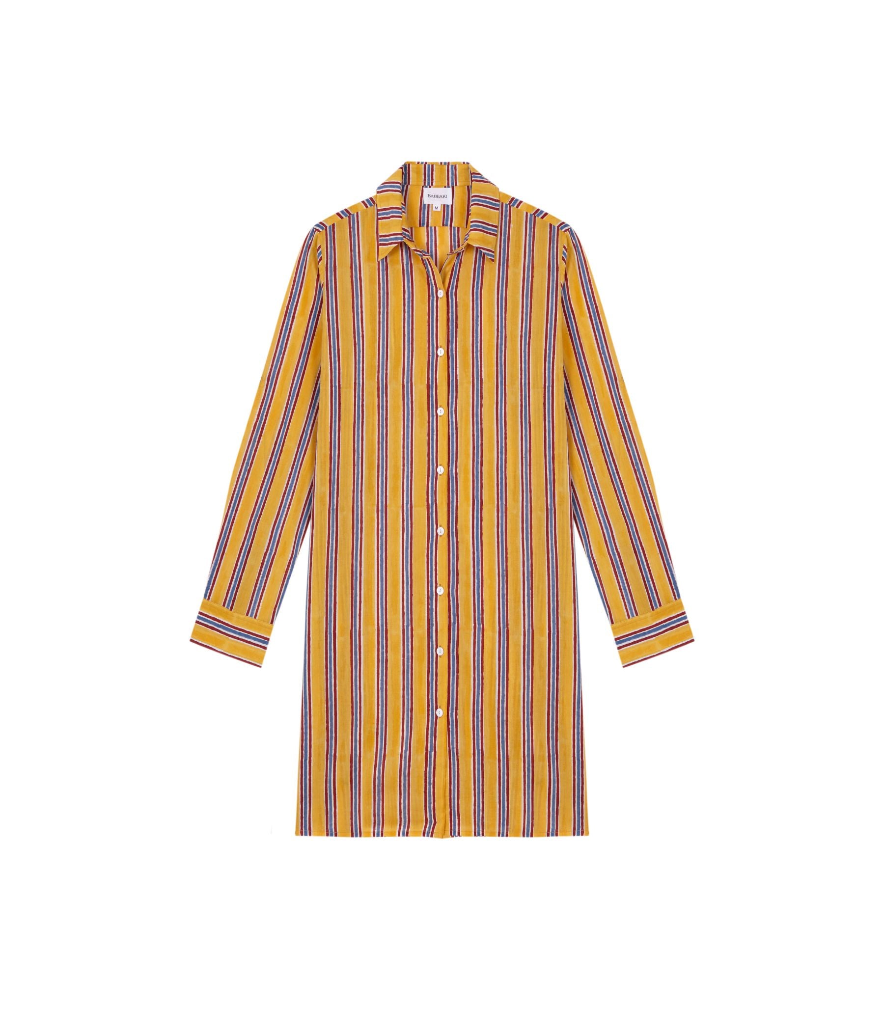 Vestido camisero de algodón con print de rayas en tonos amarillos y azules. Cuello camisa, cierre con botones delantero y mangas largas ajustables con trabilla.