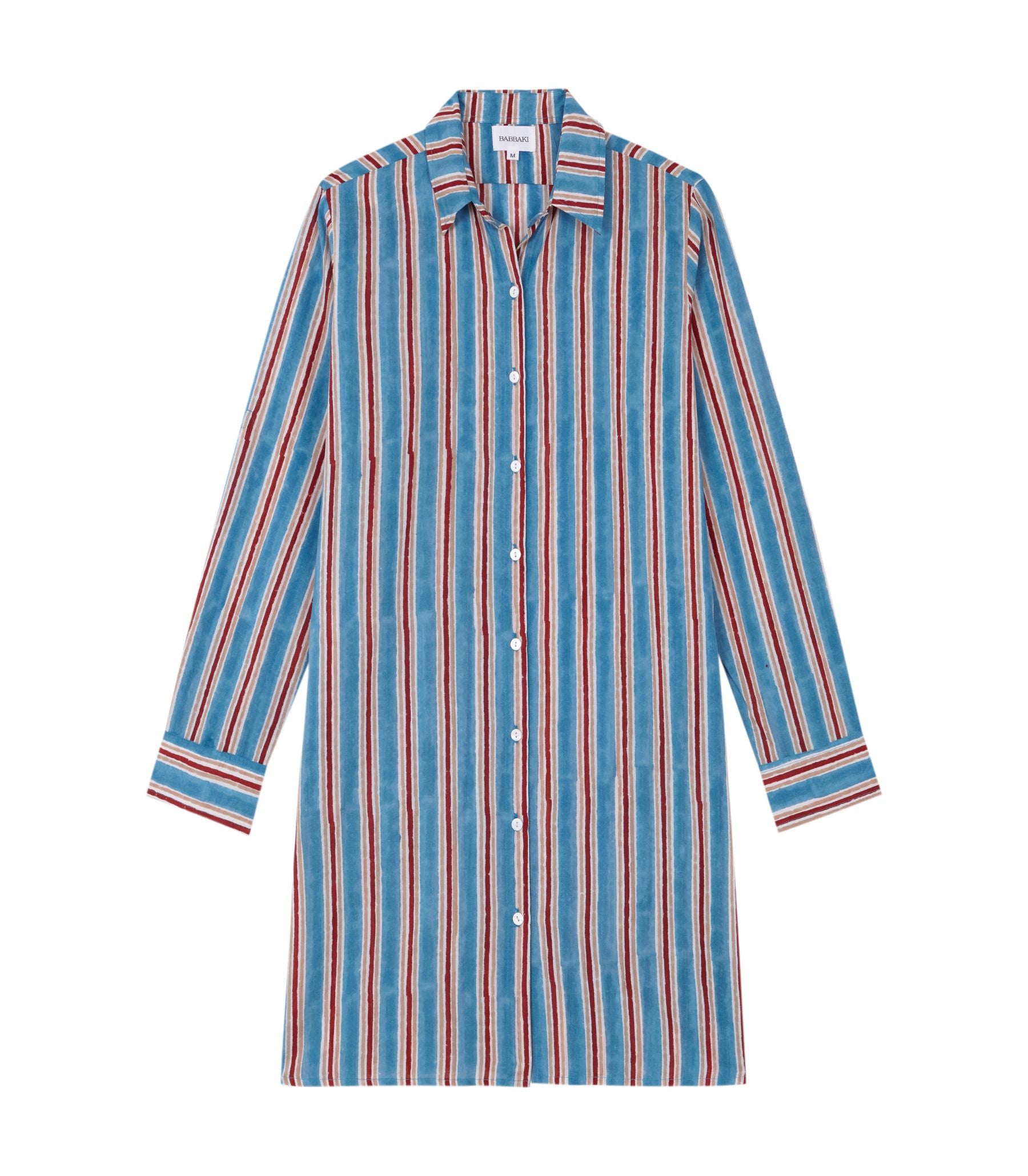 Vestido camisero de algodón con estampado de rayas en color predominante azul. Cuello camisero, cierre con botones delanteros y mangas largas ajustables con trabilla.