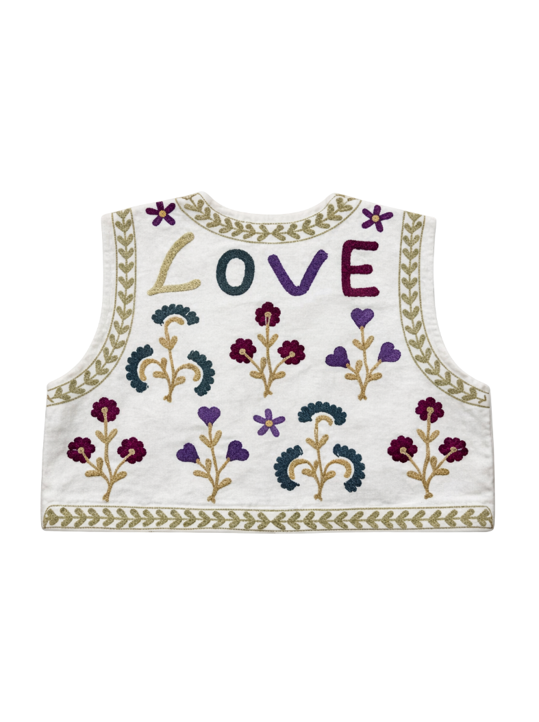 Chaleco en terciopelo color blanco con bordados multicolor. Forro estampado en rayas azul marino y blanco.