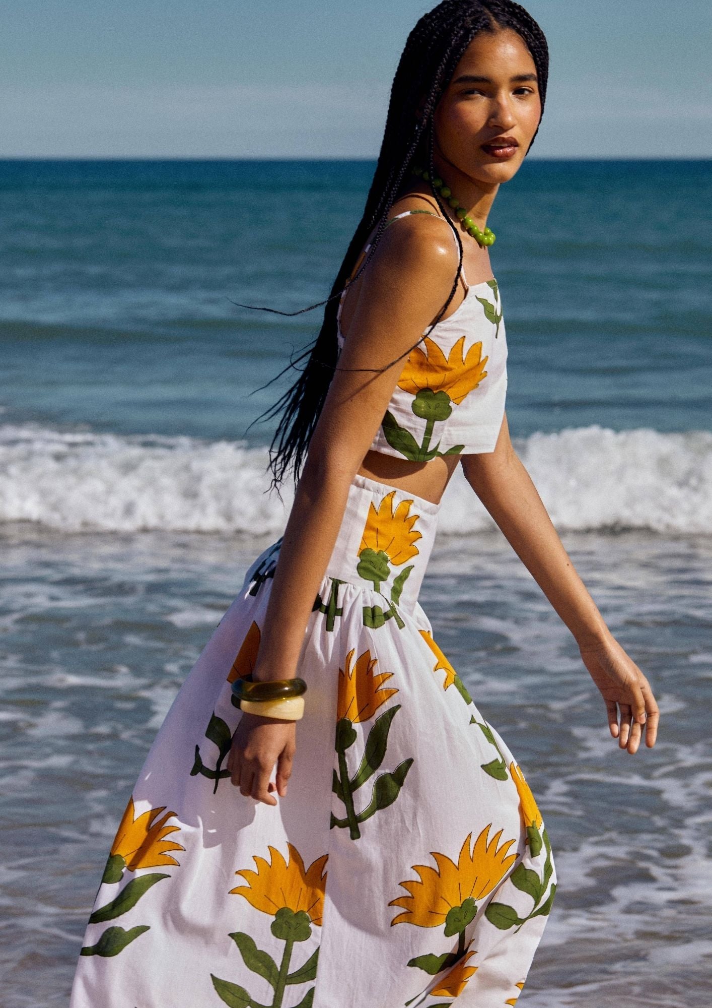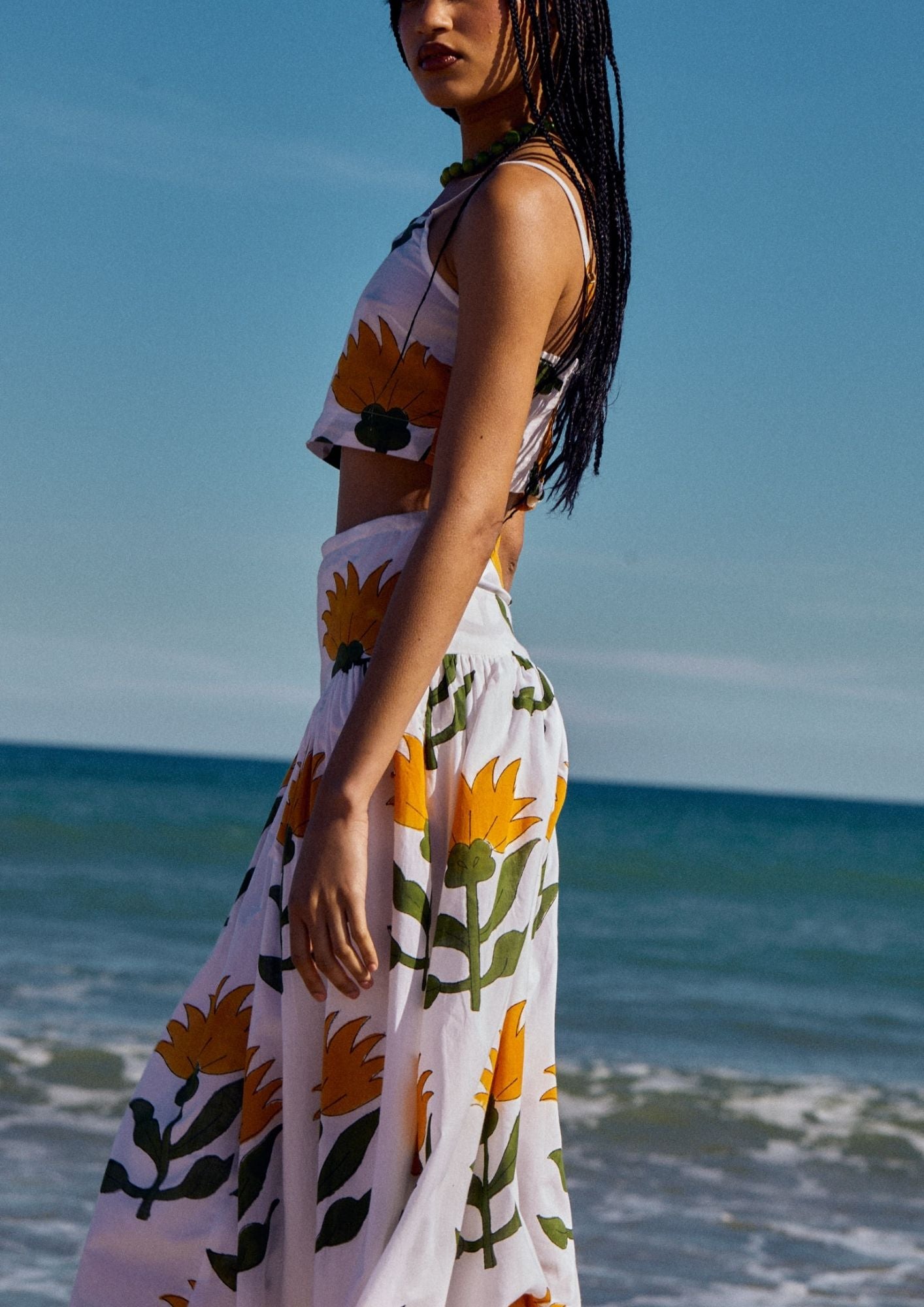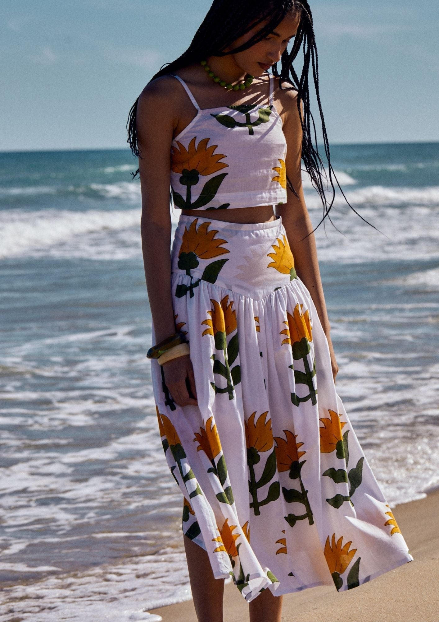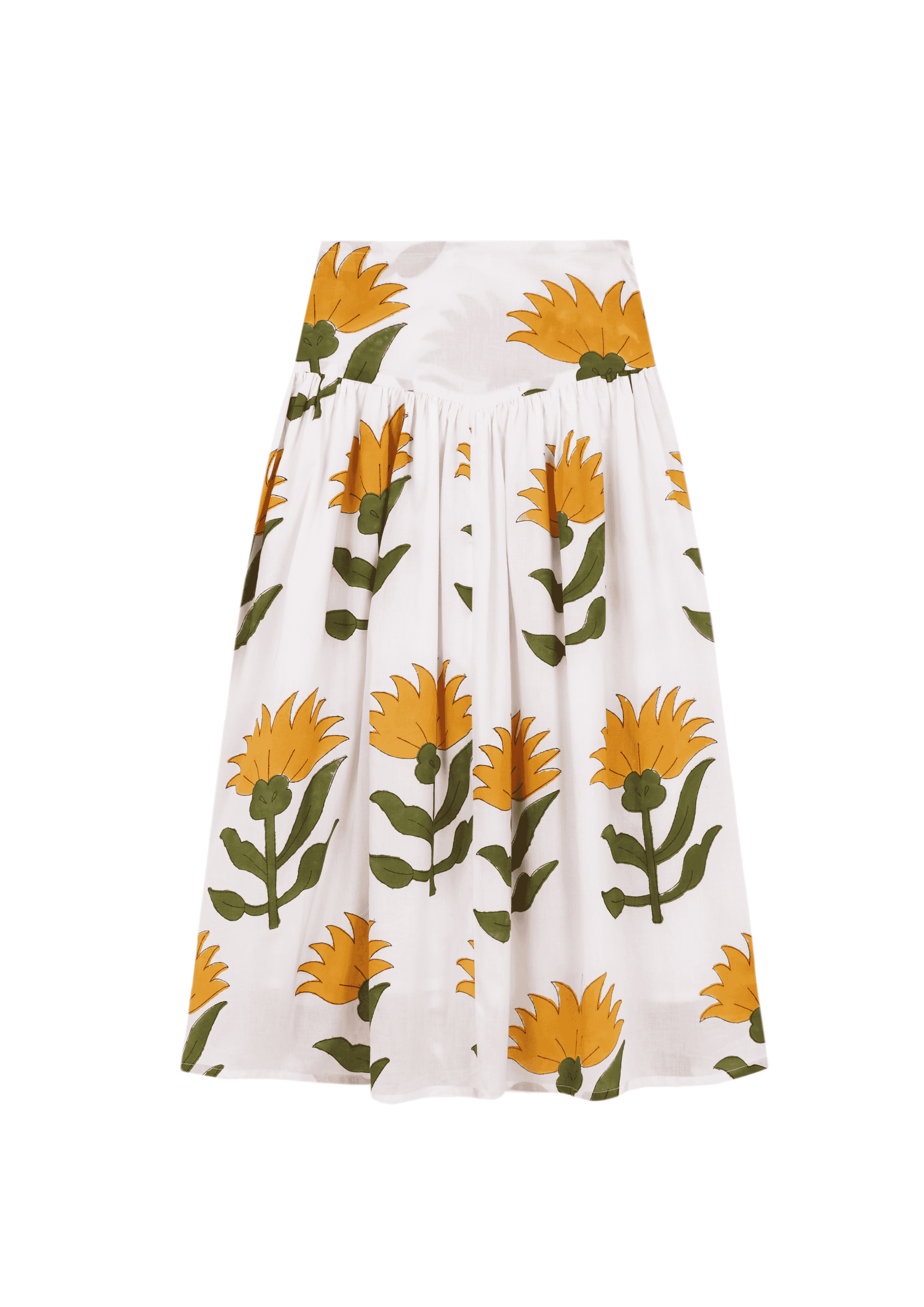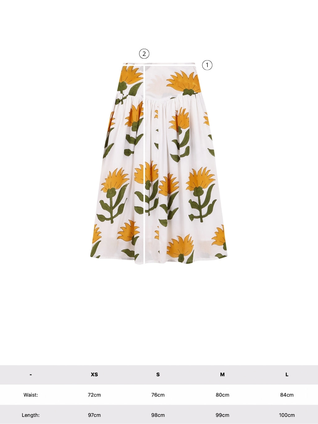 Falda midi de talle alto con estampado floral y forro ligero de algodón. Cierre con cremallera lateral.