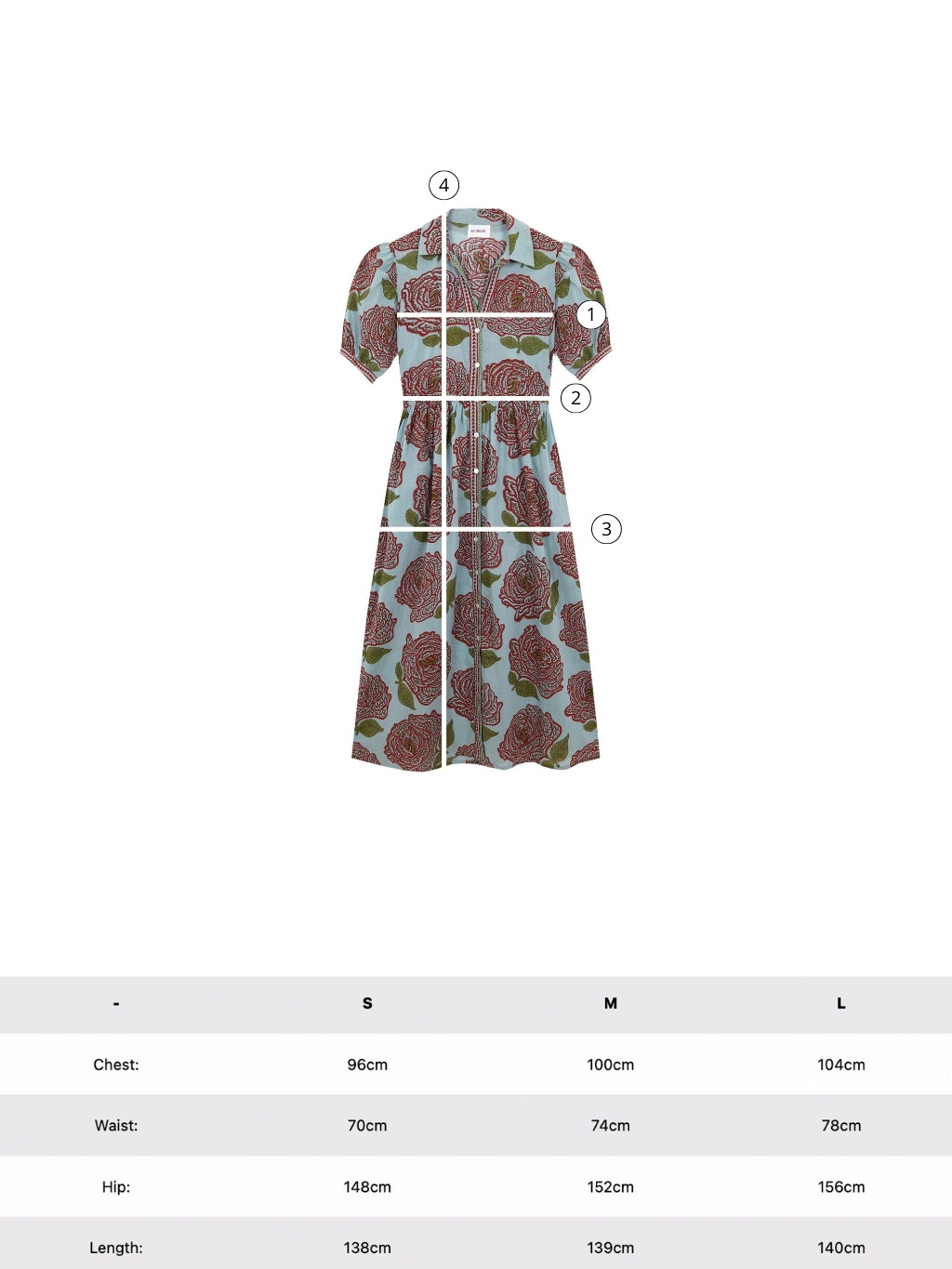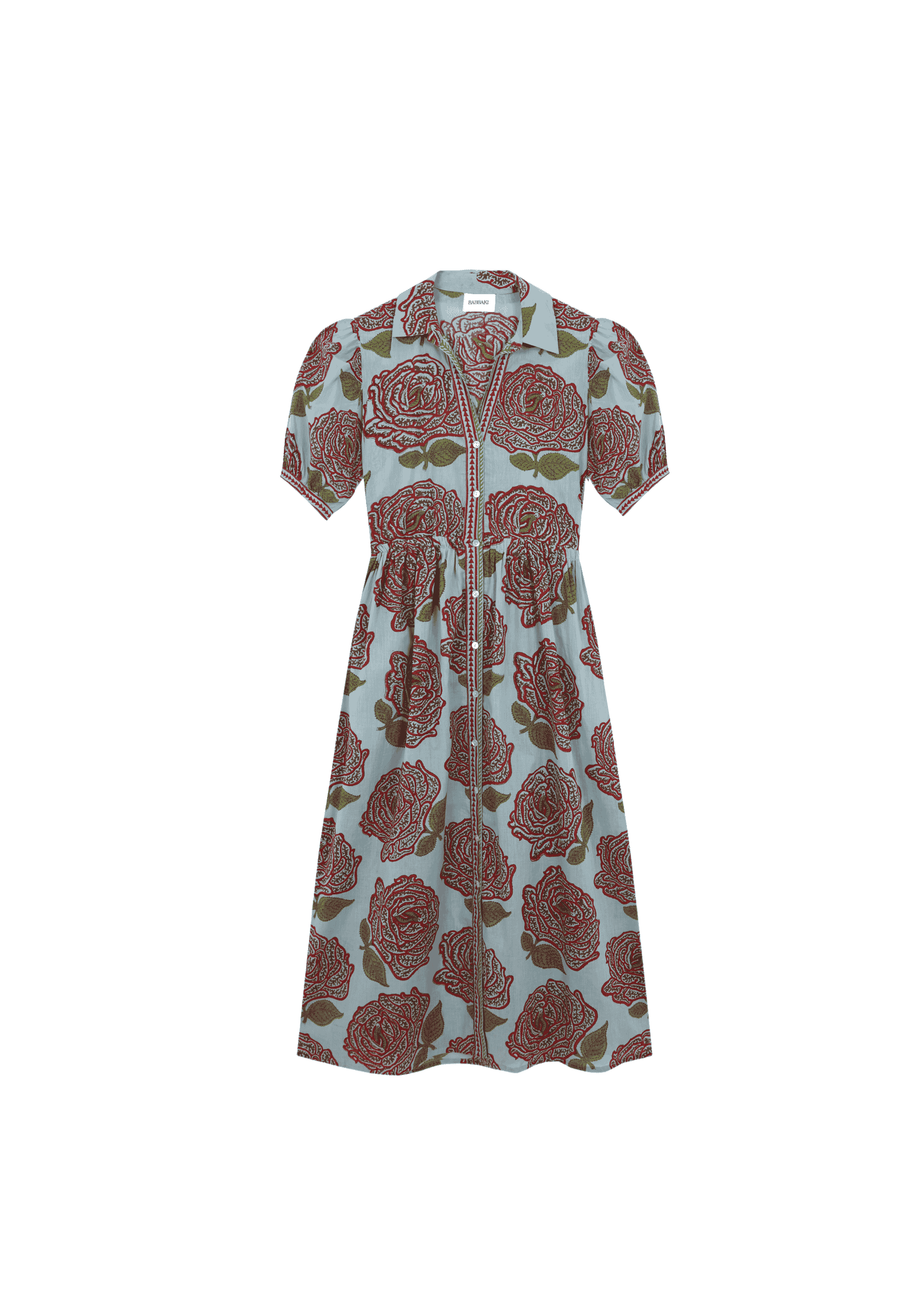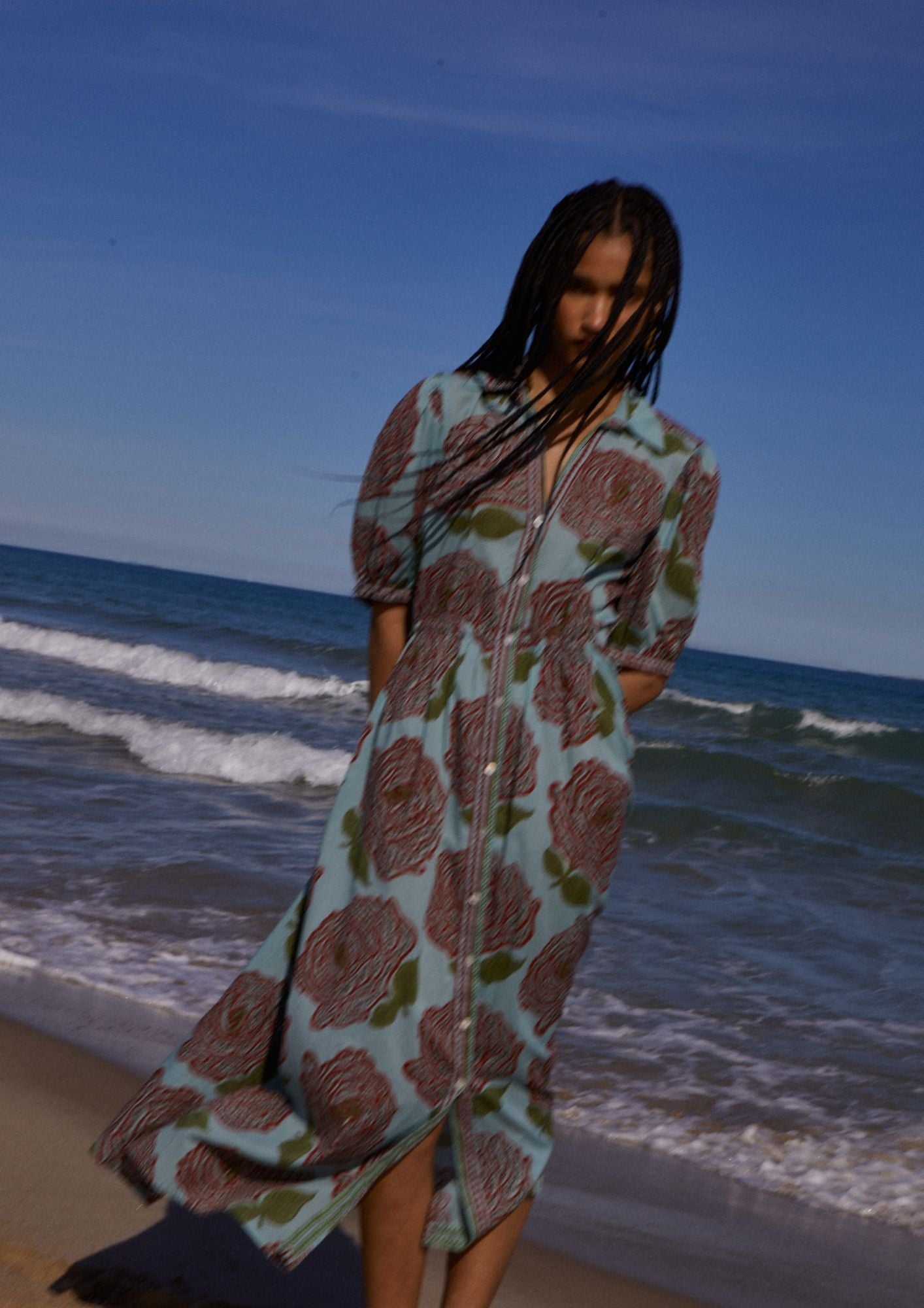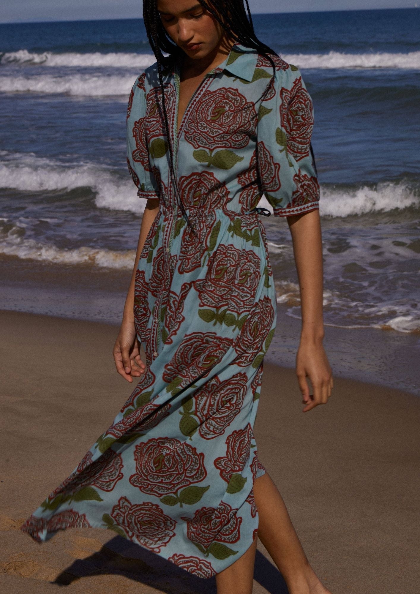 Vestido con estampado de flores sobre fondo azul. Cuello camisero, cierre frontal con botones. Manga corta abullonada y cintura ajustable con cordones.