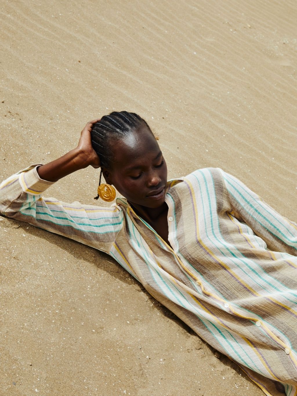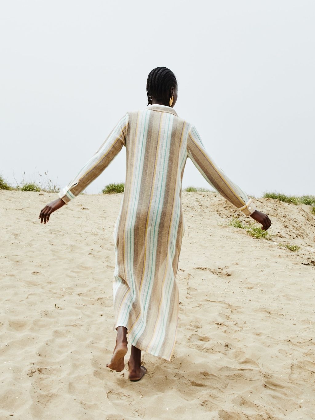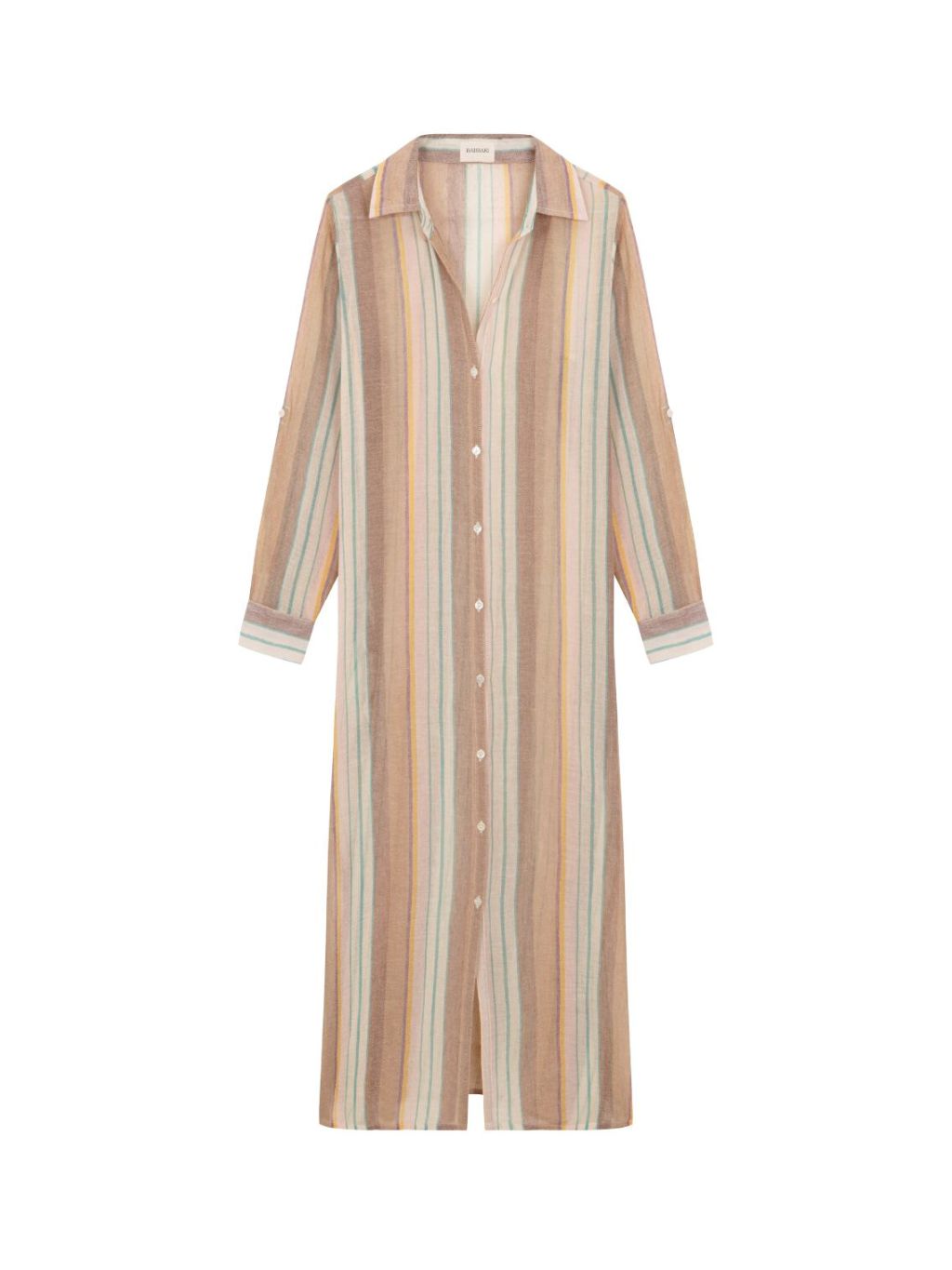 Vestido camisero en algodón 100% con textura lino para una caída suave y fluida. Cierre frontal con botones, bajo con aberturas laterales y bolsillos invisibles. Incluye trabilla para las mangas.