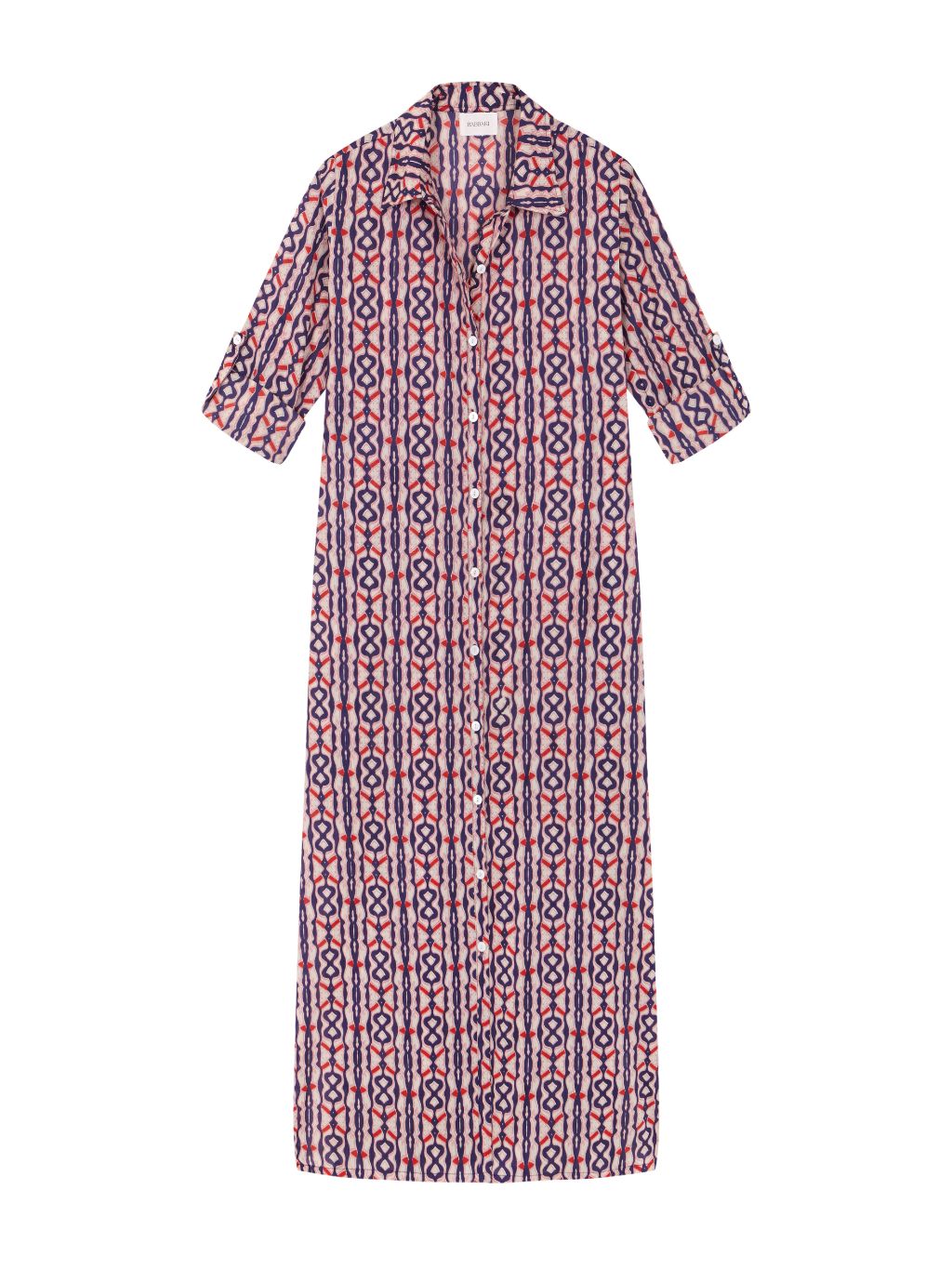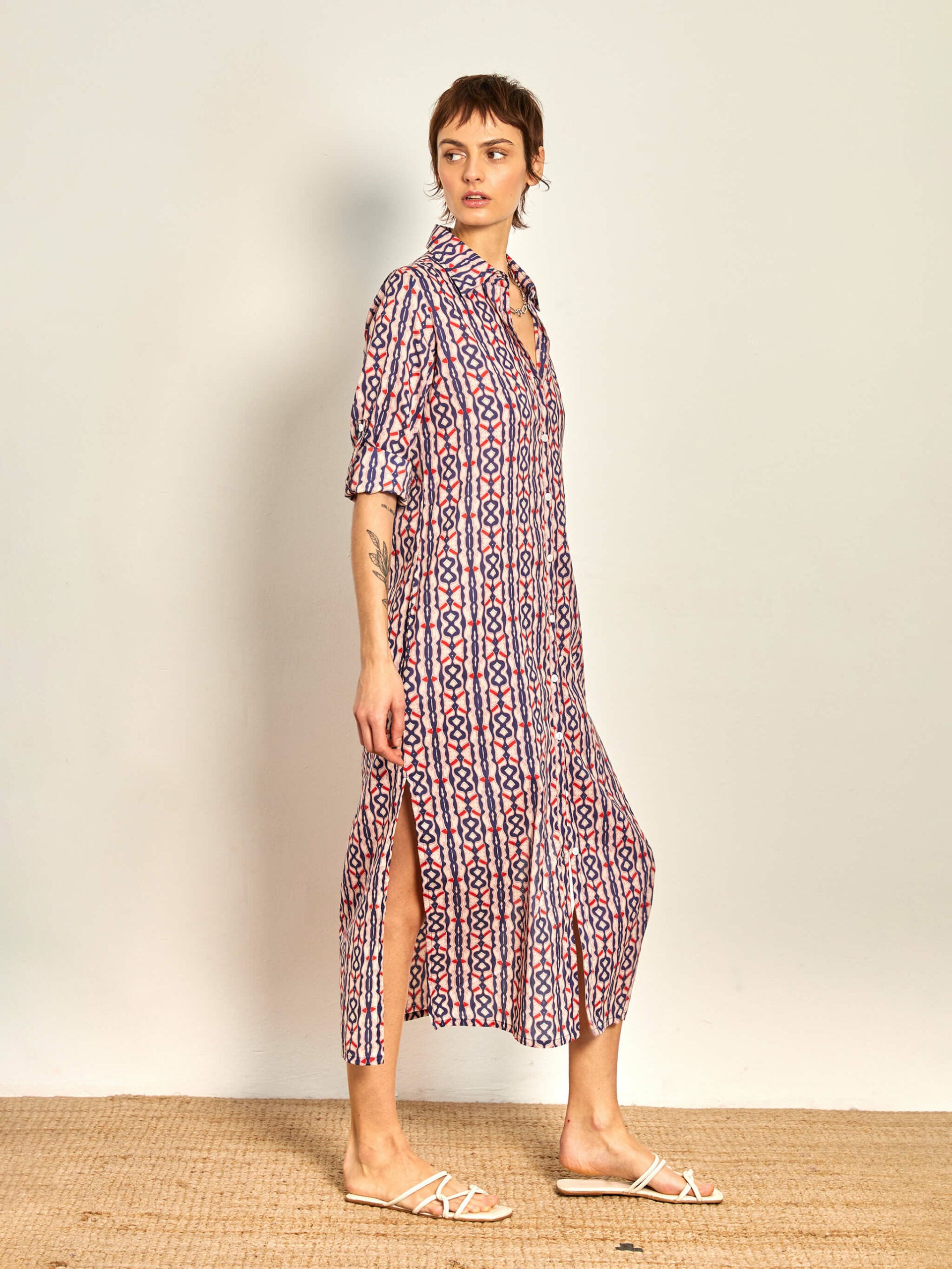 Vestido camisero con print en tonos rosados y azules. Cierre frontal con botones, con tapeta a contraste.Bajo con aberturas laterales y bolsillos invisibles. Incluye trabilla para las mangas.