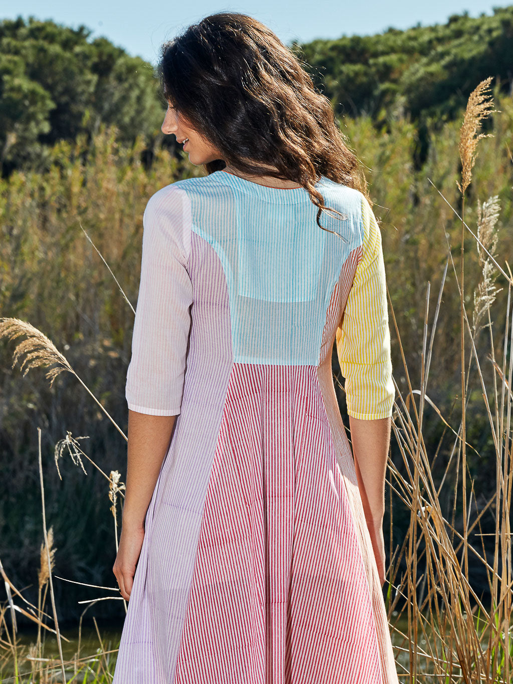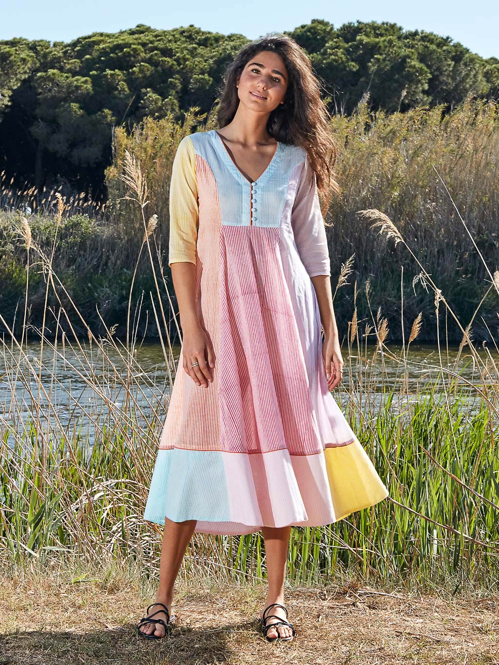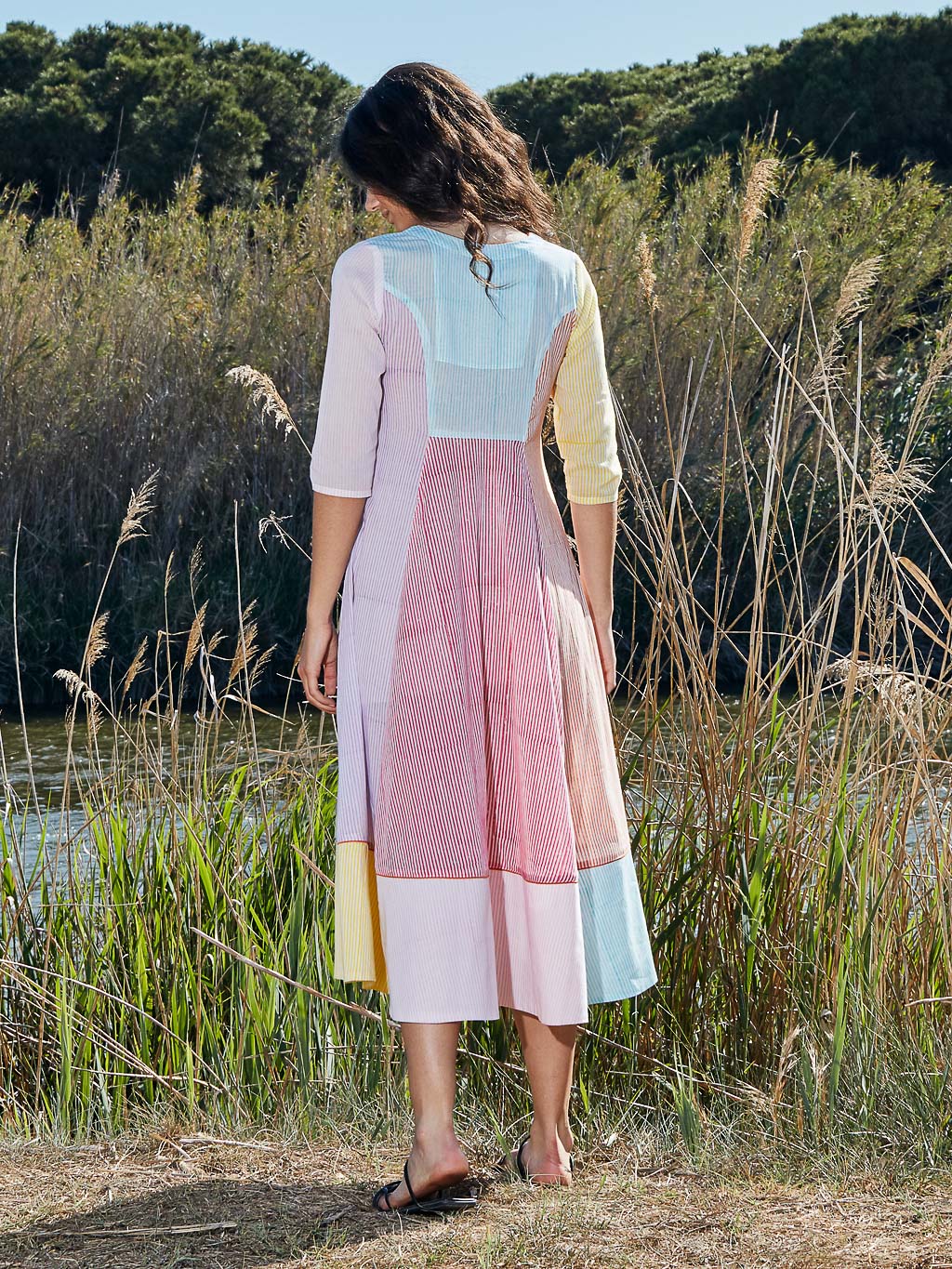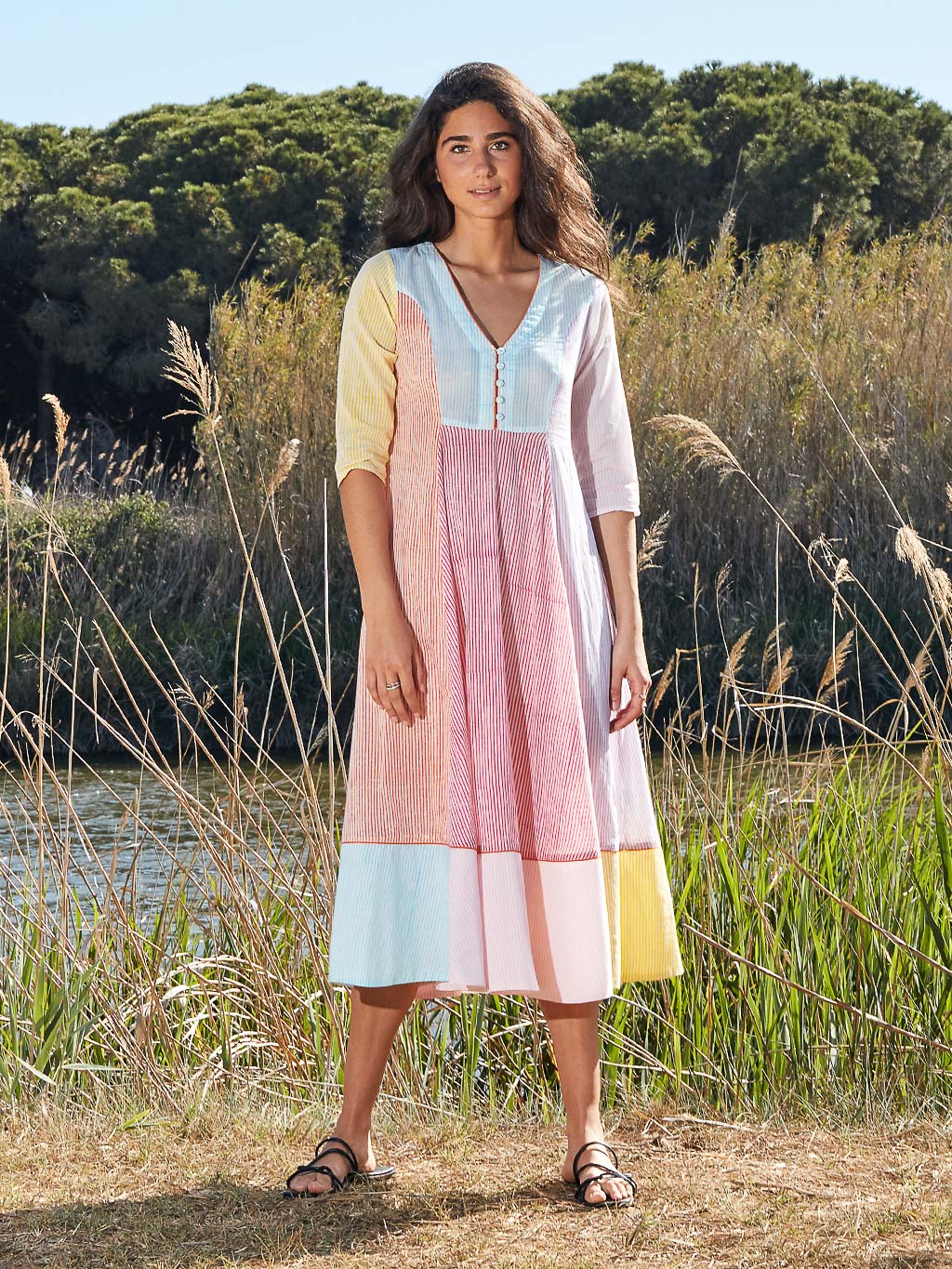 Vestido midi manga francesa en estampado de rayas multicolor. Escote V acabado con botones forrados y ribete blanco.