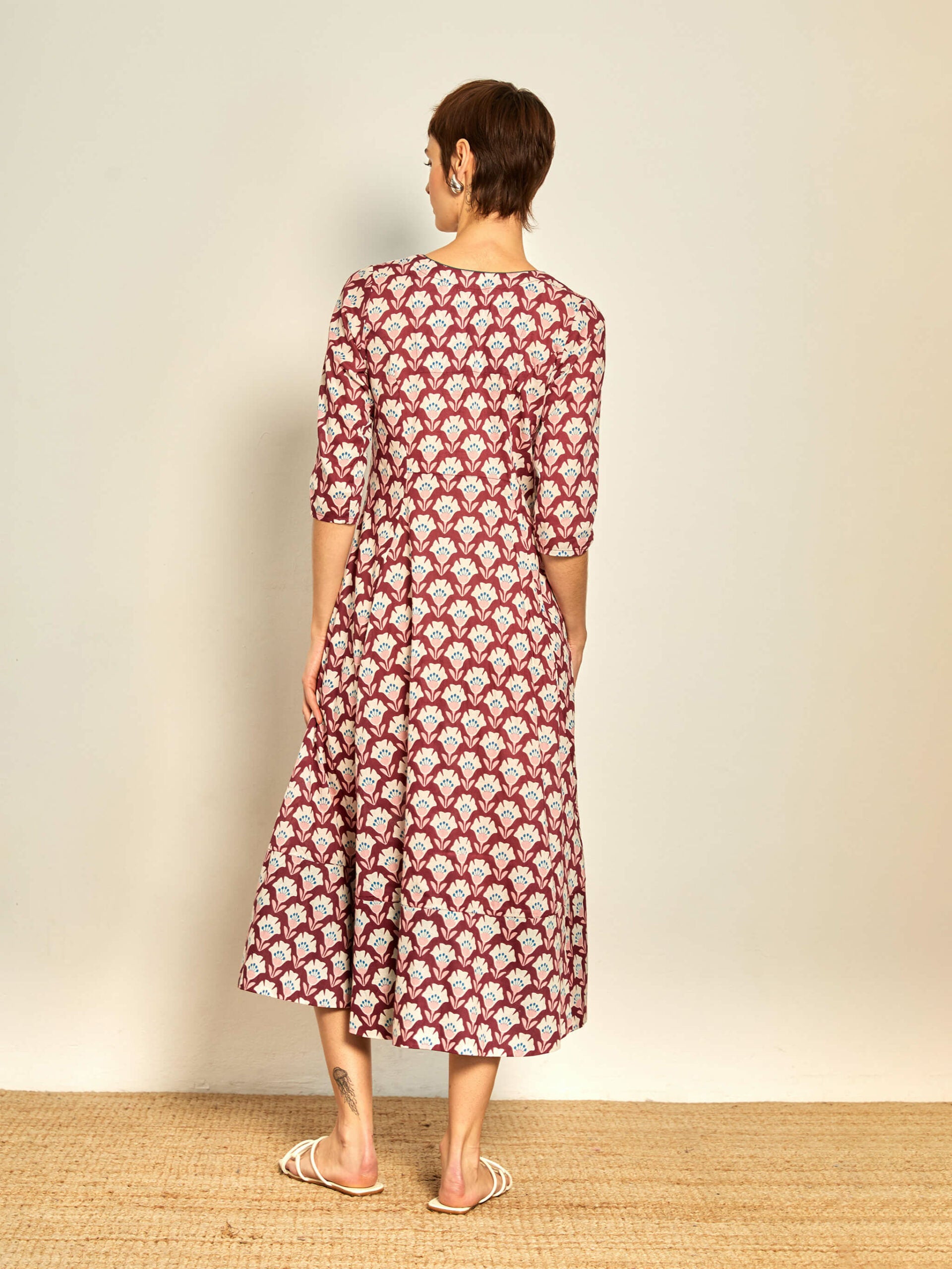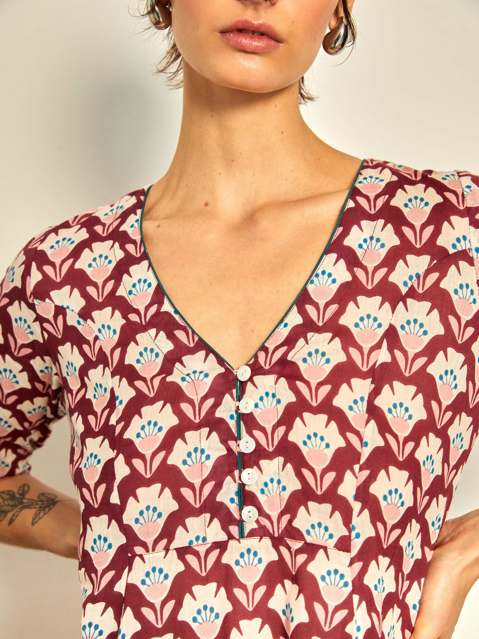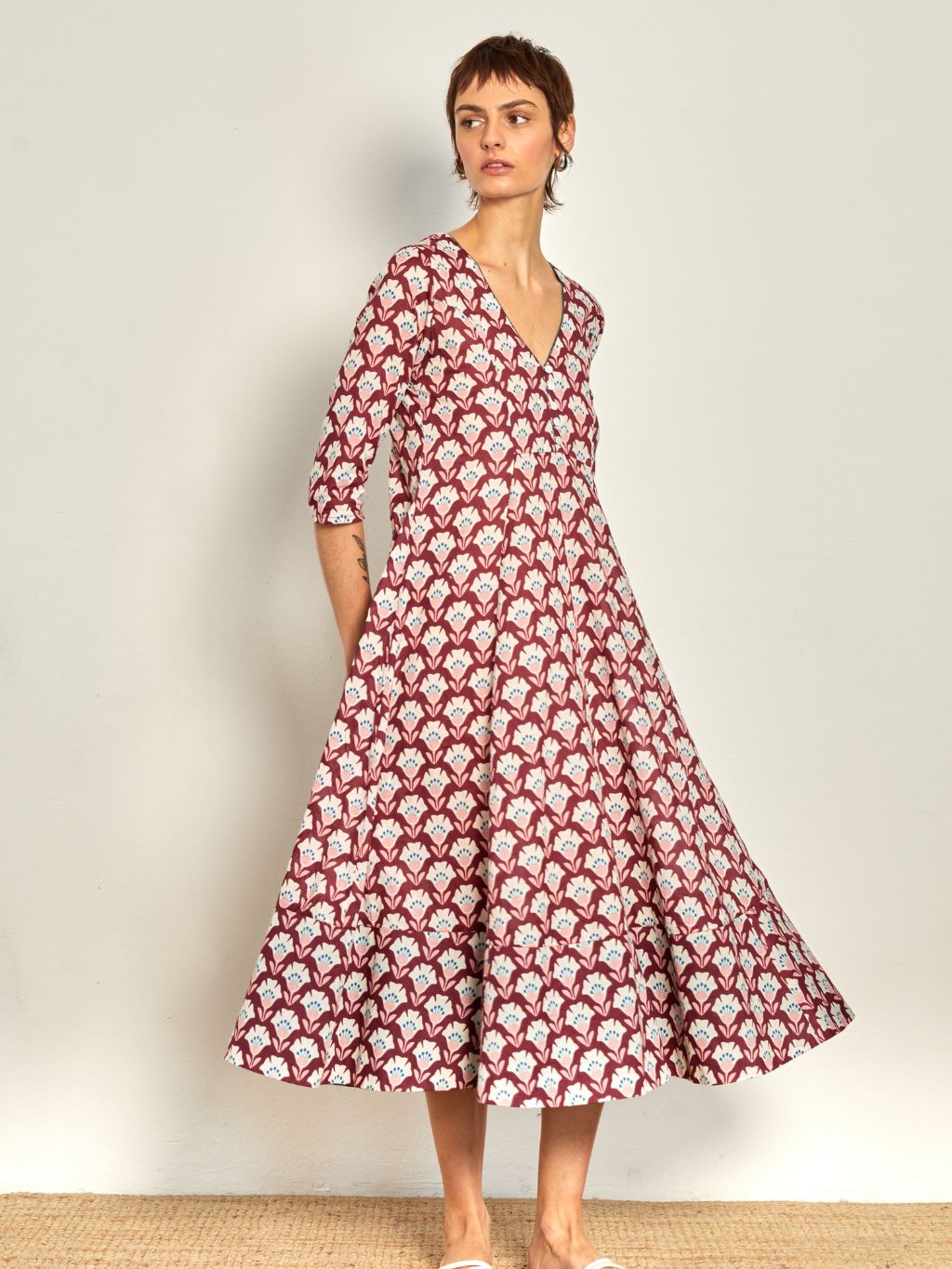 Este vestido ha sido estampado a mano con la técnica artesanal del blockprint, lo cual convierte cada prenda en única.